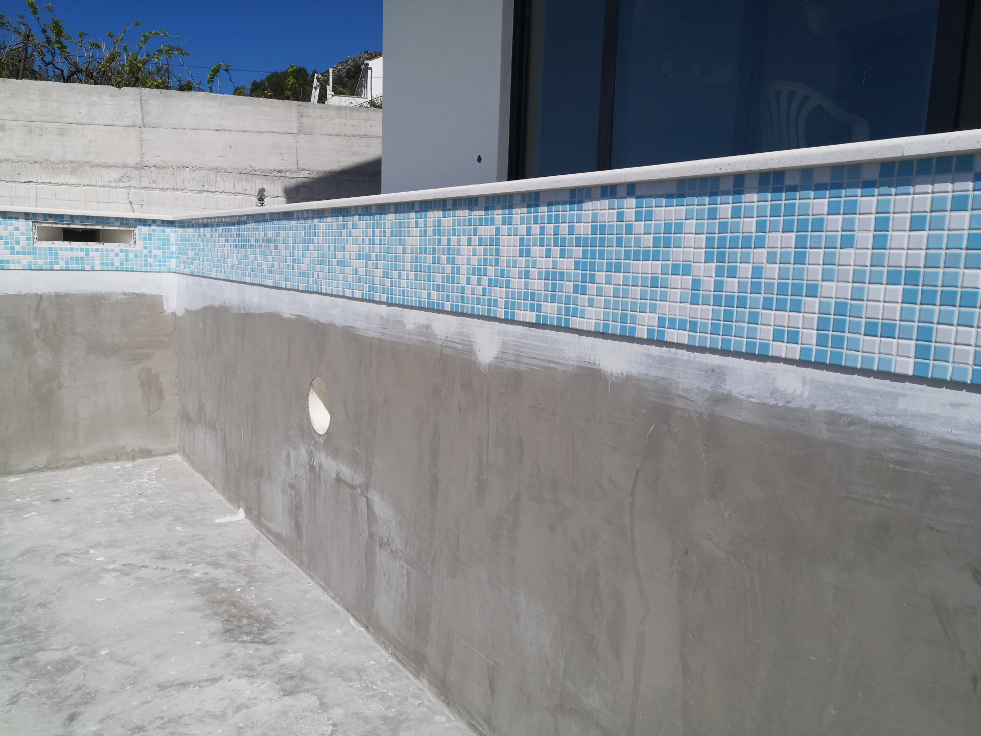 After the construction of the reinforced concrete walls, and before putting back filling around the pool it is necessary to hydro insulate the wall from the outside to protect the reinforced structure inside the concrete from effects of soil water, this is definitely necessary for ceramic tile pools.
