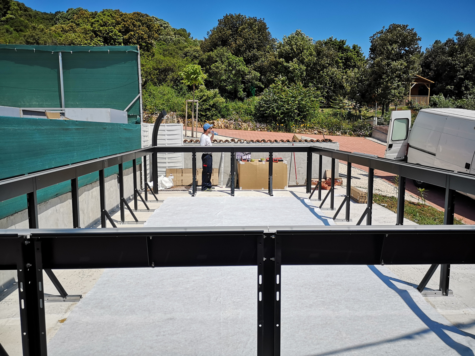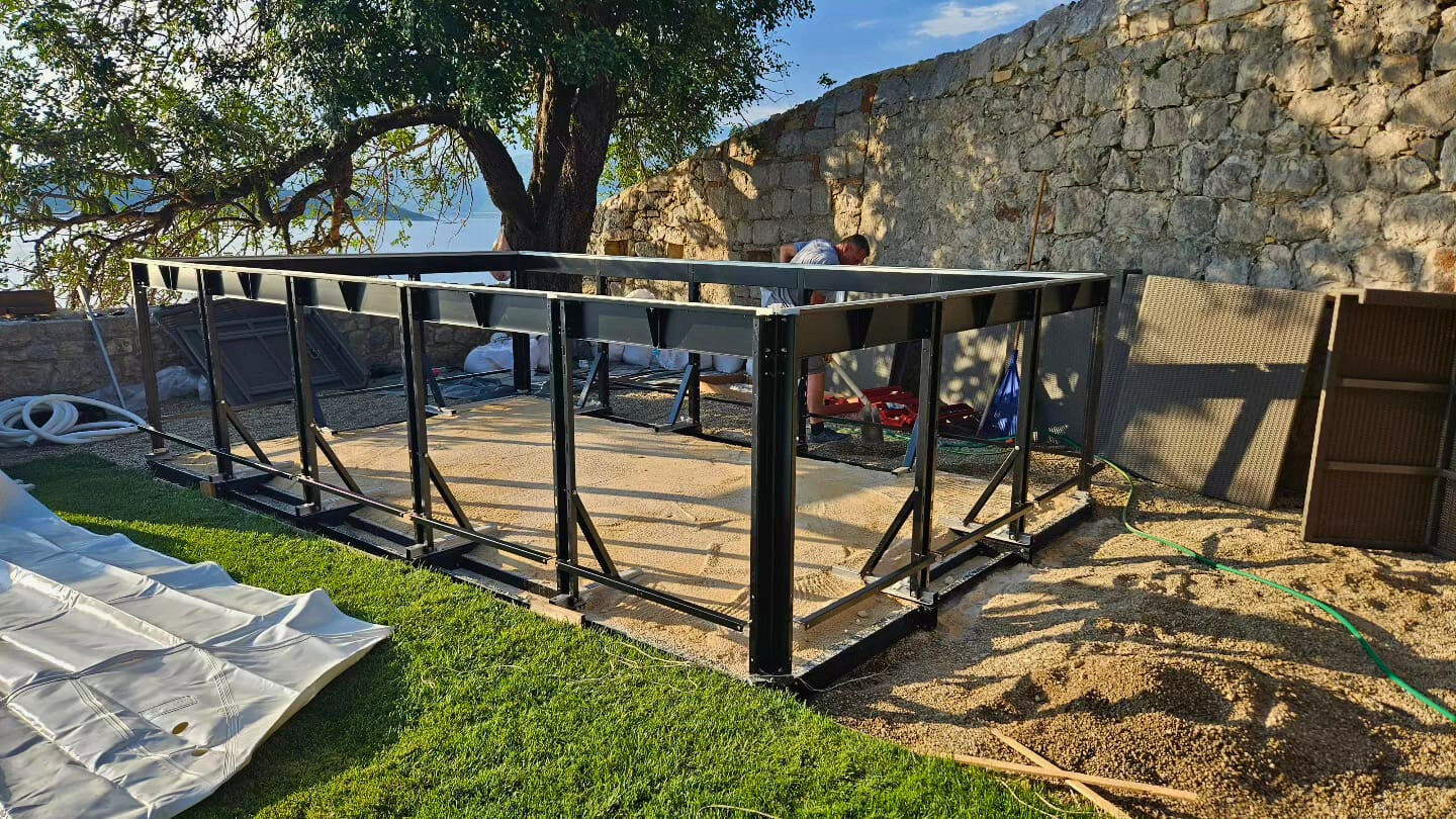 Ako nije moguće izgraditi betonsku ploču moguće je bazen napraviti korištenjem samo metalne konstrukcije bez uporabe betona.